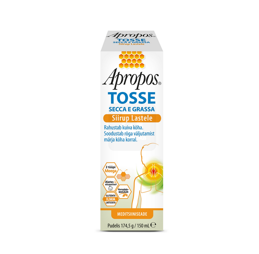 Piemērots gan sausam, gan mitram klepum, nomierina klepu, mazina kairinājumu un veicina bronhiālo sekrētu šķidruma veidošanos, atvieglojot krēpu izdalīšanos. Turklāt medus un augļu garša padara Apropos Klepus sīrupu patīkamu, īpaši bērniem. Piemērots bērniem no 1 gada vecuma.