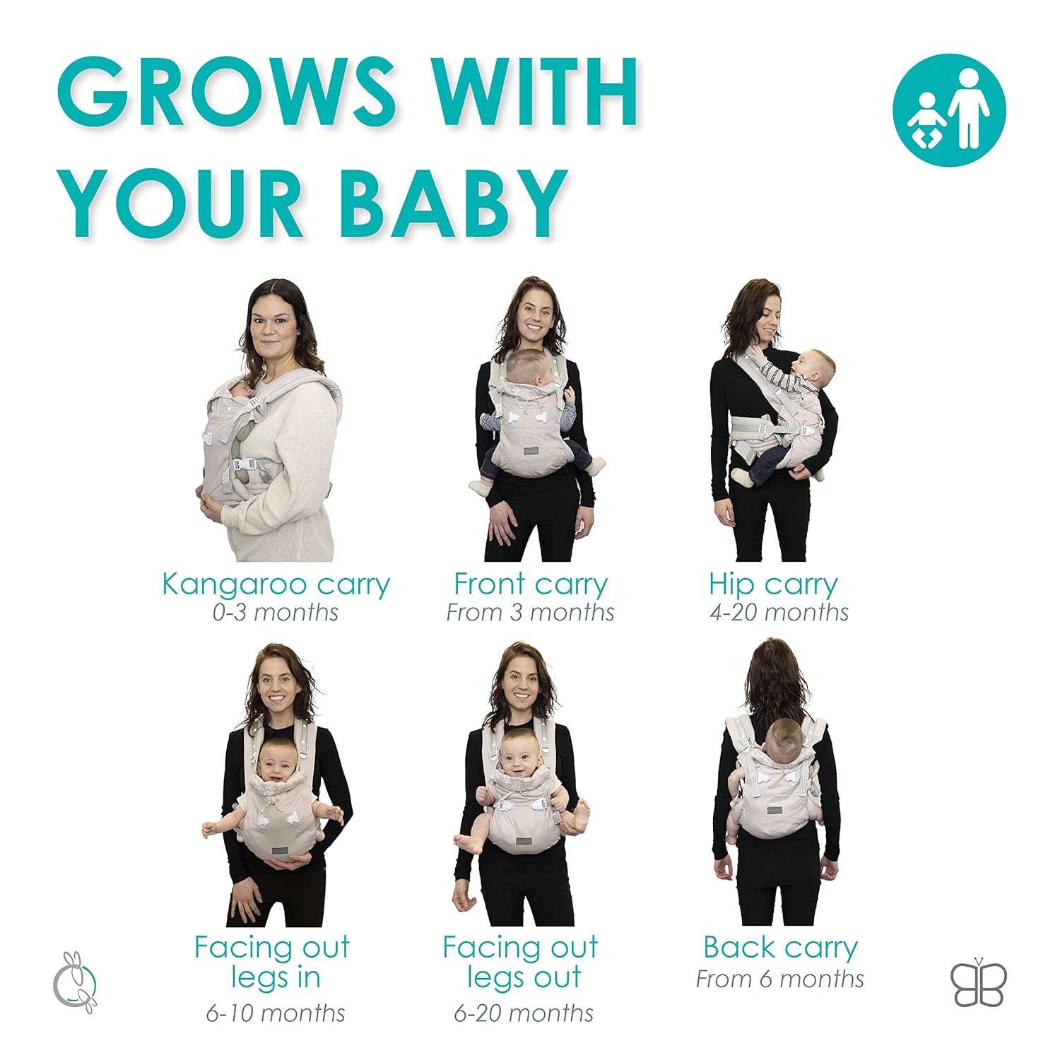 Pateicoties sešām nēsāšanas pozīcijām atbilstoši vecumam, nomoda līmenim vai aktivitātei, jūs varat viegli mainīt bērna pozu – no mugursomas līdz nēsāšanai priekšpusē, kā arī izvēloties pozu ar skatu uz vecākiem vai ārā, pēc nepieciešamības.