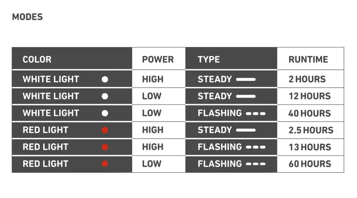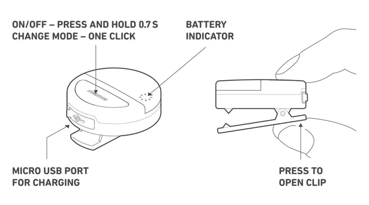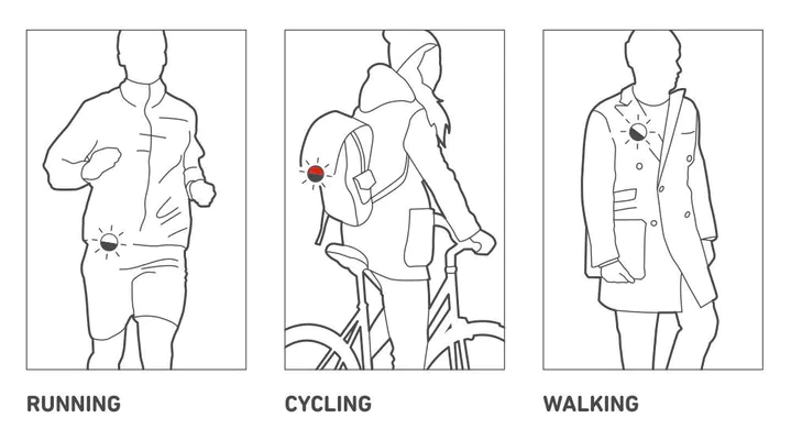 Luktūram ir dažādi režīmi, kas nodrošina dažādu darbības ilgumu (skat. attēlus). Atstarotāju ar vienu klikšķi var piestiprināt pie apģērba, somas vai jebkuras vietas, kur iespējams piestiprināt. Atstarotāju varat izmantot arī dažādās aktīvās nodarbībās, piemēram, skrienot, braucot ar velosipēdu, ejot utt.