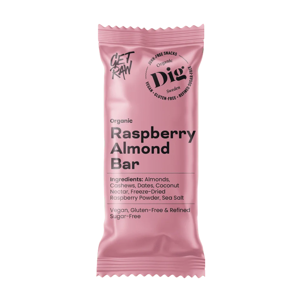 Mandeļu (25%), Indijas rieksti, dateles, kokosriekstu nektārs, saldēti kaltēts aveņu pulveris (10%), jūras sāls. Bioloģisks.