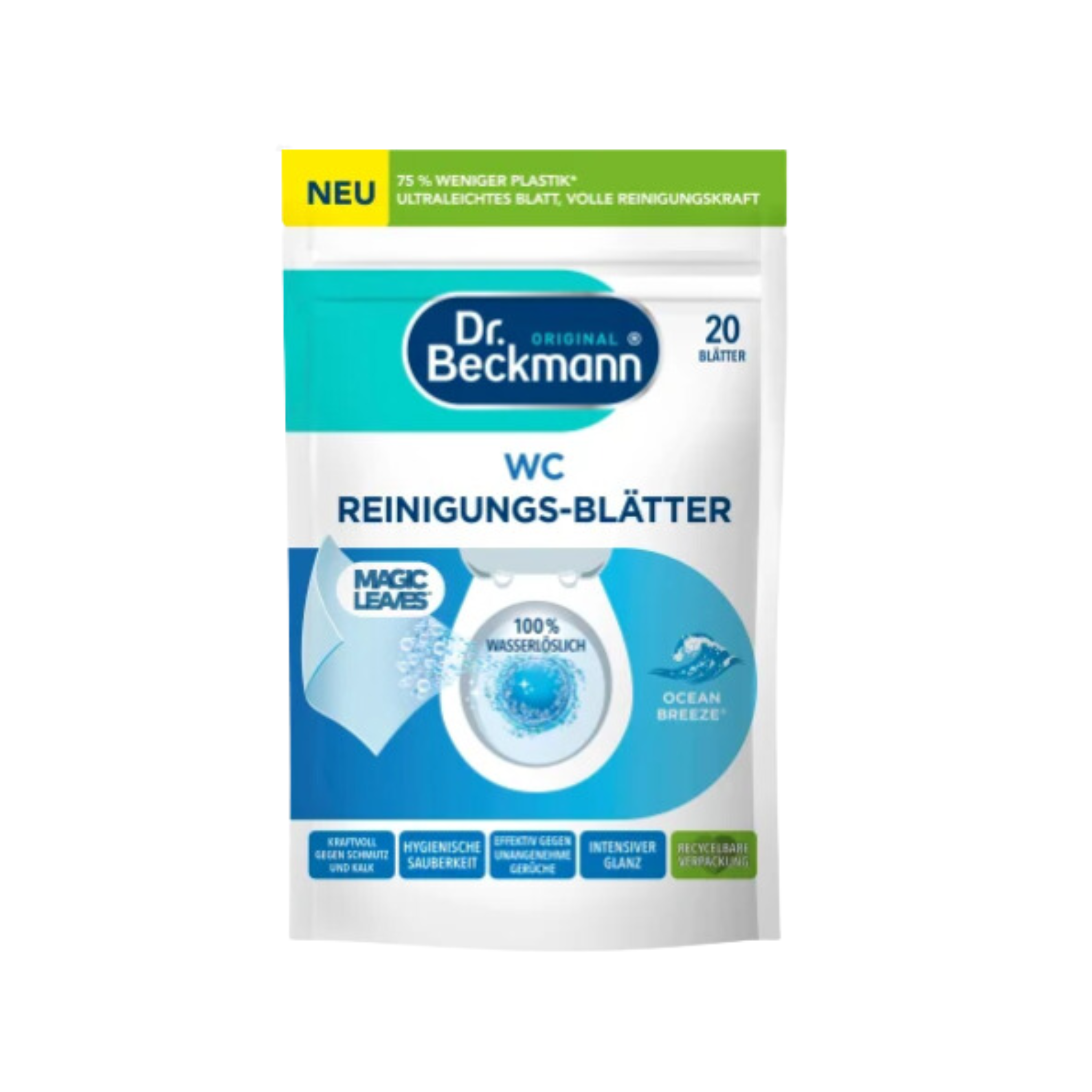 Ar Dr. Beckmann Ocean Breeze tualetes tīrīšanas salvetēm Jūs ne tikai samazināsiet plastmasas patēriņu, bet arī padarīsiet savu tualeti mirdzoši baltu. Loksnes ir pilnībā šķīstošas ūdenī un īpaši efektīvas pret netīrumiem un kaļķakmeni.
