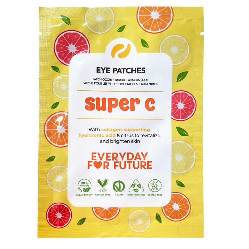 Super C Kirgastavad silmaplaastrid toovad silmaümbrusele kohest sära, niisutust ja värskust, muutes need ideaalseks vananemise ilmingute vältimiseks ja vähendamiseks. Tsitruselised – apelsin ja laim – on tuntud oma võimsate antioksüdantsete omaduste poolest, mis aitavad stimuleerida rakkude uuenemist, parandada naha tekstuuri ja võidelda vabade radikaalidega. Tulemuseks on silmaümbrus, mis näeb välja puhanud, särav ja siledam.