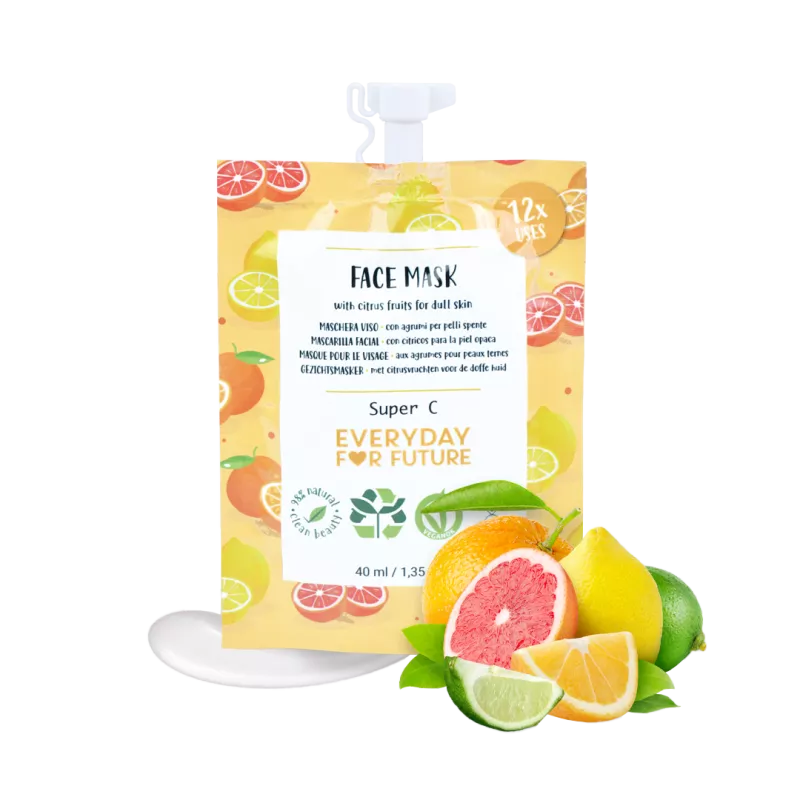 Super C Kirgastav Näomask on värskendav ja energiat andev näomask, mis kasutab tsitrusviljade looduslikku jõudu, et anda nahale sära ja elastsust. Tsitrusviljad on tuntud oma tugeva antioksüdantse mõju poolest – need aitavad aeglustada naha vananemise märke, toetavad rakkude uuenemist ja niisutavad tõhusalt. Maski koostist on rikastatud laimi ja apelsini ekstraktidega, mis muudavad jume kirgastavamaks ja ühtlasemaks.