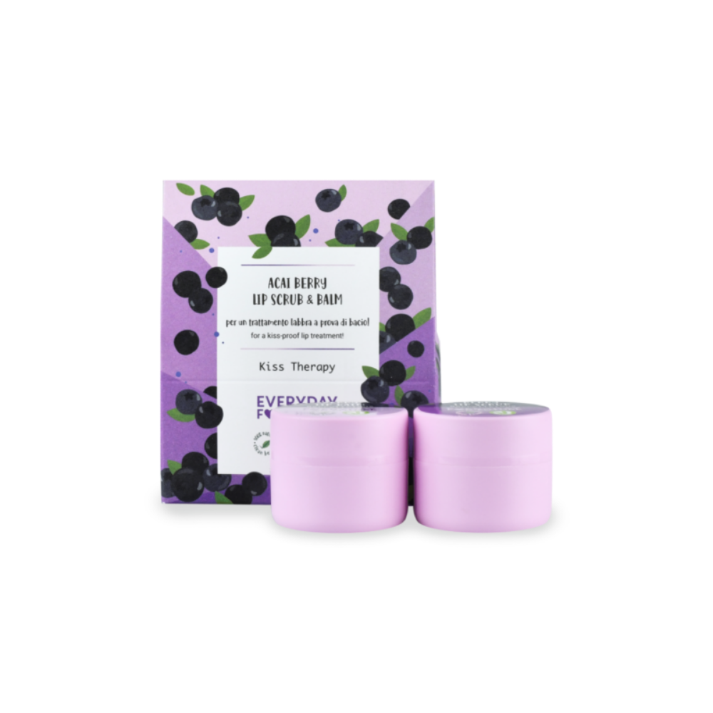 Organiska acai ogu ekstrakts piedāvā izcilu antioksidantu un nomierinošu iedarbību uz ādu, padarot lūpas mīkstas, gludas un dziļi koptas. Acai ogu bagātīgais uzturvielu profils palīdz uzlabot lūpu elastību un pasargā tās no ārējiem faktoriem. Kiss Therapy ir divu soļu lūpu kopšanas rutīna, kas no pirmās lietošanas atjauno lūpu mīkstumu, mitrumu un dzīvīgumu. Augstas kvalitātes dabiskās un organiskās eļļas un vaskii saudzīgi eksfoliē, atjauno mitruma līdzsvaru un atstāj lūpas samtaini mīkstas. Piemērots ikdienas lietošanai gan aukstos, gan karstos laikapstākļos, kad lūpas prasa papildu kopšanu un aizsardzību.