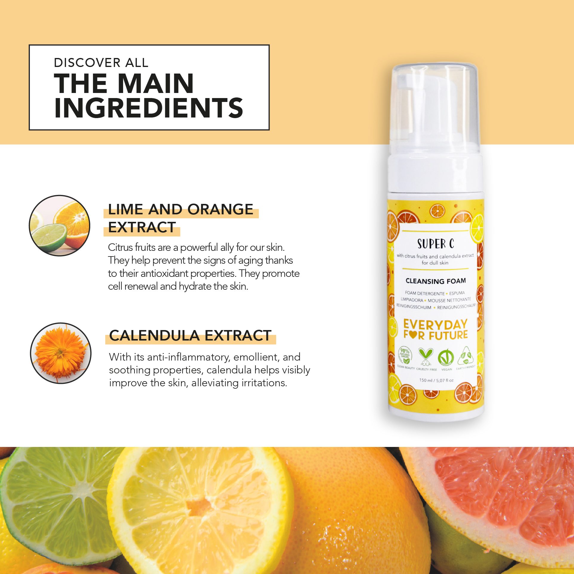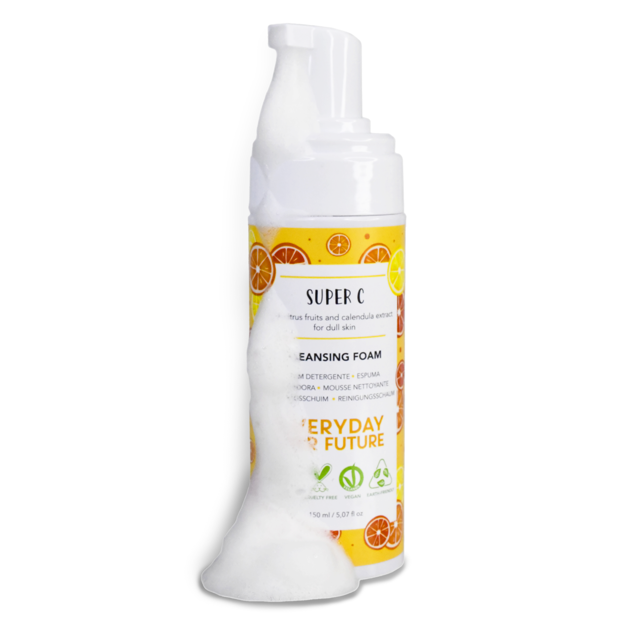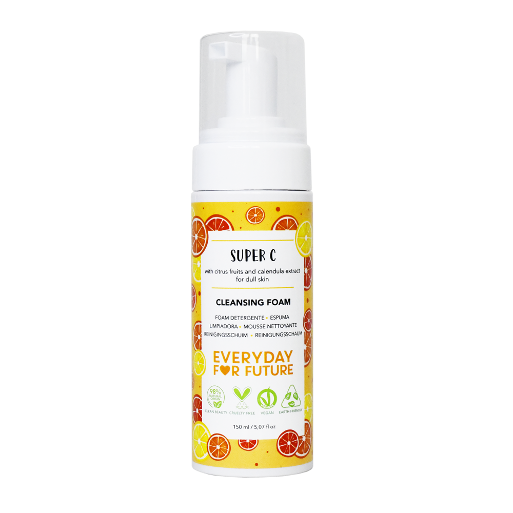 Tīrīšanas putas izgatavotas no 98% dabiskas izcelsmes sastāvdaļām, un iepakojums ir ražots no 75% pārstrādātas plastmasas – laba izvēle gan jūsu ādai, gan planētai.