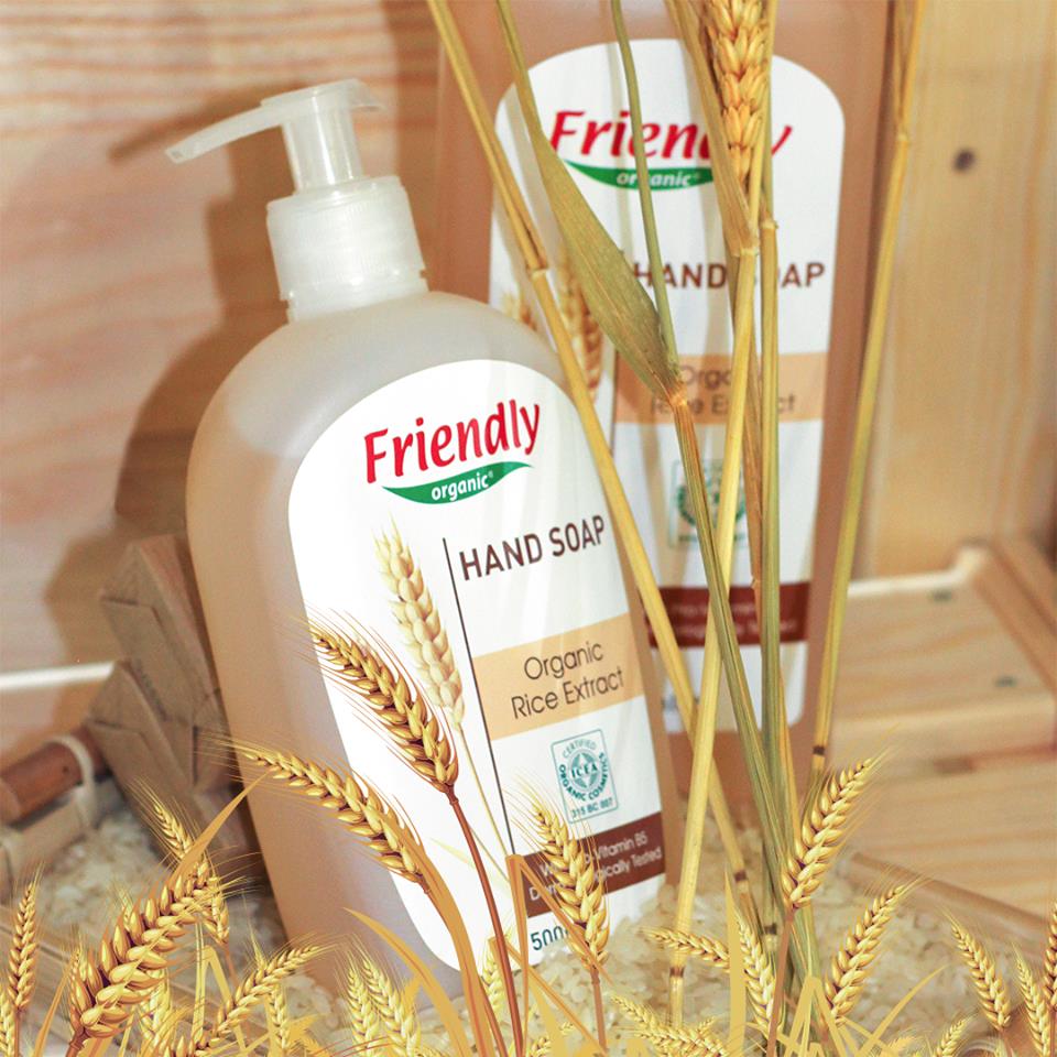 Friendly Organic šķidrās ziepes ar augu izcelsmes sastāvdaļām maigi attīra rokas. Organiskais rīsu ekstrakts kopā ar provitamīnu B5 mitrina ādu, attīra rokas un atstāj uz ādas svaigu aromātu. Ziepes ir saudzīgas pret ādu pat biežas lietošanas gadījumā un ir ideāli piemērotas visas ģimenes roku mazgāšanai.
