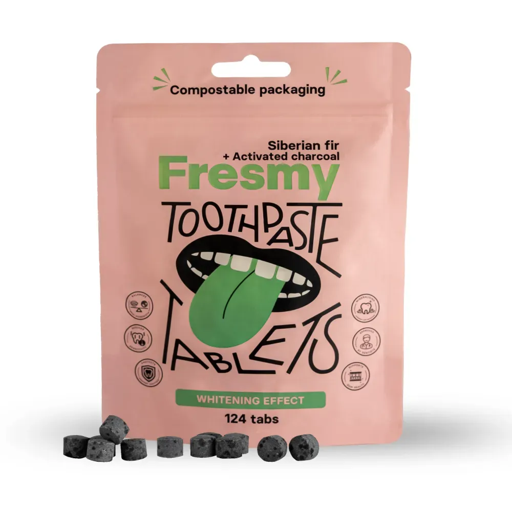 Siberijas egles un aktivētās ogles zobu pastas tabletes satur hidroksiapatītu (HAp), kas ir netoksiska alternatīva fluoram. Tas dabiski atjauno zobu emalju.