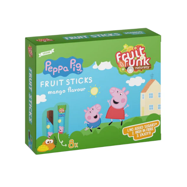 Atklāj jaunu tropisku garšu Peppa Pig faniem! Jautrajā iepakojumā ir 8 x 10g mango garšas augļu batoniņi, kas pagatavoti tikai no 100% dabīgām sastāvdaļām. Lieliski piemēroti uzkodai skolā, pārgājienā vai veselīgai un uzturvielām bagātai uzkodai jebkurā laikā. Bez pievienota cukura, daudz šķiedrvielu, bez lipekļa un vegāniski!