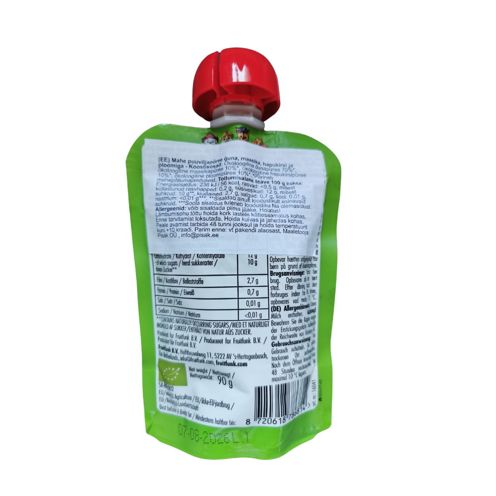 PEACH BITE: augļi 159 g* (koncentrēts ābolu biezenis 73 g*, koncentrēta ābolu sula 65 g*, koncentrēts persiku biezenis 21 g*), citrusaugļu šķiedra, želejviela: augļu pektīns, dabīgs persiku aromatizētājs ar citām dabīgām aromatizējošām vielām. *g izmantots 100 g gatavā produkta. Uzturvērtība 100 g: Enerģētiskā vērtība: 1387 kJ/328 kcal, tauki: 1,1 g, tostarp piesātinātās taukskābes: 0,3 g, ogļhidrāti: 73,5 g, tostarp cukuri: 68,3 g*, šķiedrvielas: 7,3 g, olbaltumvielas: 1,9 g, sāls: 0,1 g. *Tikai dabīgais cukurs, kas atrodas augļos.