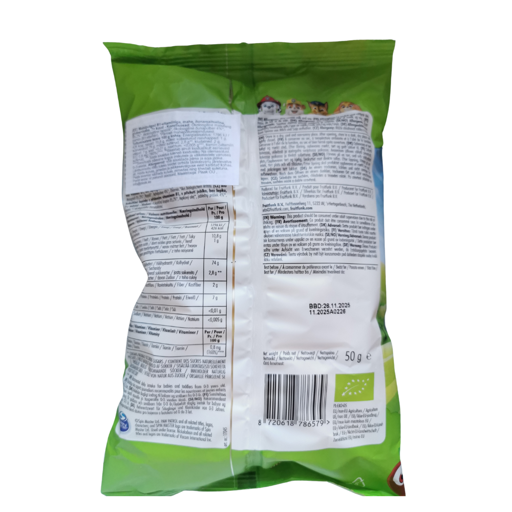 Sastāvdaļas: dateles pasta, ābolu pasta (koncentrēta ābolu sula, koncentrēts ābolu biezenis, želejvielas: augļu pektīns, antioksidants: askorbīnskābe), citrona koncentrāts, zemeņu pulveris 1%, dabīgas aromatvielas. Uzturvērtība uz 100 g: Enerģētiskā vērtība: 1253 kJ/298 kcal, tauki: 0,5 g, tostarp piesātinātās taukskābes: <0,1 g, ogļhidrāti: 69 g, tostarp cukuri: 63 g*, šķiedrvielas 6,9 g, olbaltumvielas: 1,8 g, sāls: 0,1 g. *Tikai augļos esošie dabīgie cukuri. Alergēni: Var saturēt graudaugu, kas satur glutēnu, soju un pienu, riekstus un zemesriekstus. Var saturēt augļu kauliņu fragmentus.