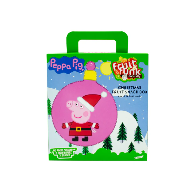 Peppa Pig Ziemassvētku kastīte ir labākā dāvana svētkiem. Kastē ietilpst 5 mini zemeņu batoniņi, 5 mini ābolu batoniņi un 4 iepakojumi ķiršu garšas augļu uzkodu.