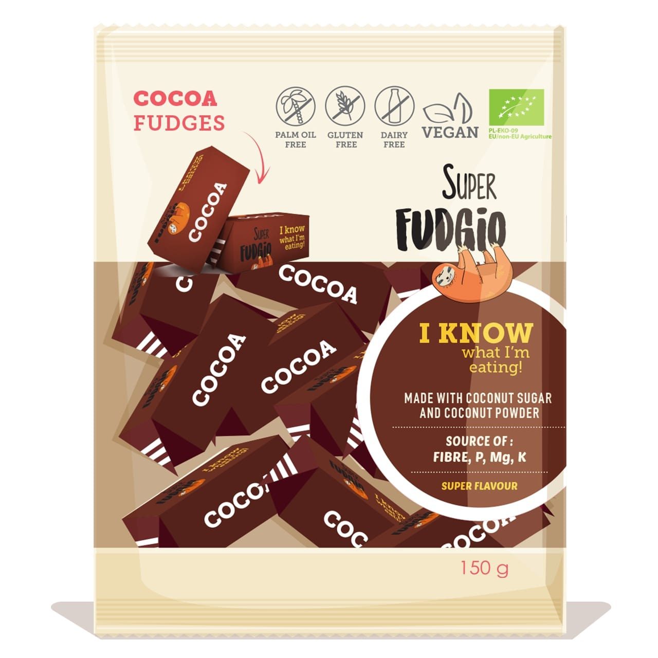 Fudgio kakao konfektes ir izcili garšīgas un bagātas ar kakao. Gatavotas tikai no bioloģiskām sastāvdaļām. Bez lipekļa. Bez palmu eļļas.