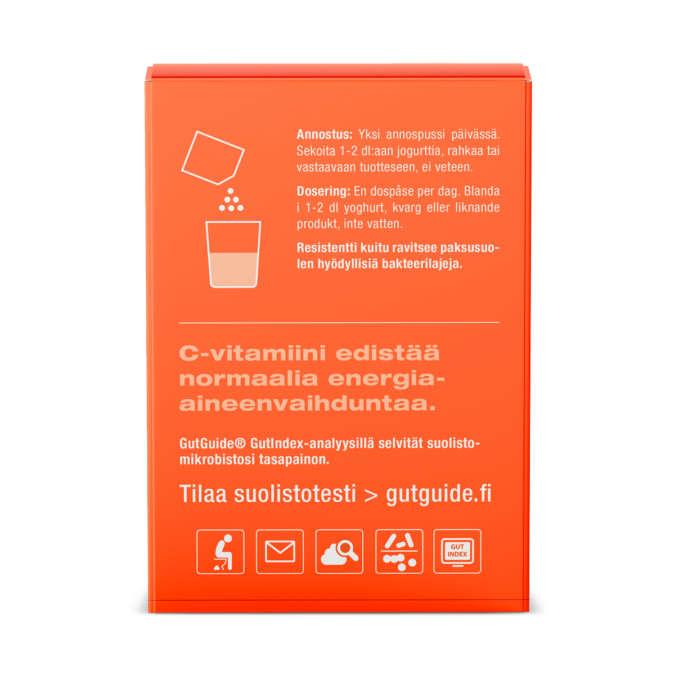 Satur: 10 miljardus dzīvu baktēriju, 12 mg vitamīna C, 3,7 g guar gumijas vienā paciņā (4 g). Iepakojumā ir 20 paciņas – 20 dienu lietošanas rezerve.