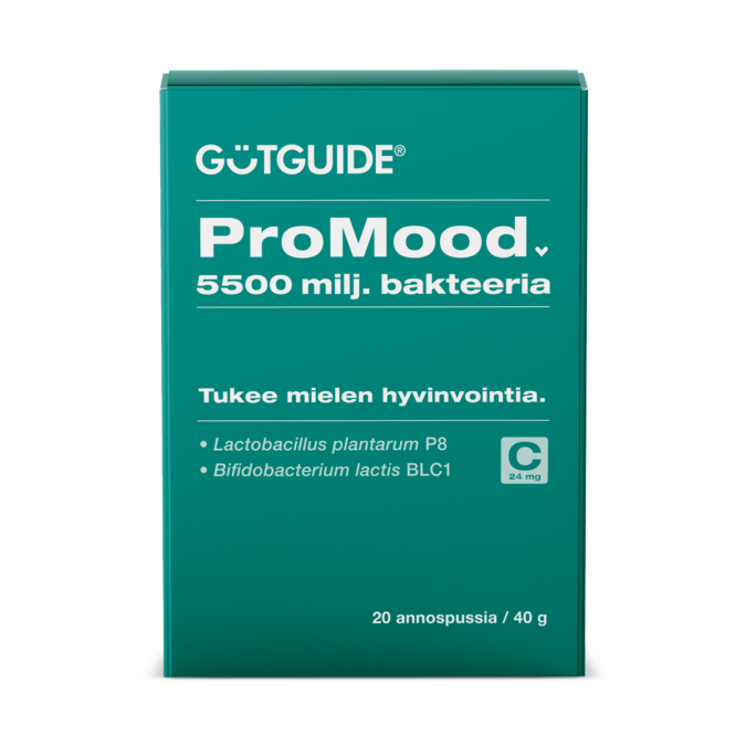 GutGuide® ProMood ir inovatīvs uztura bagātinātājs, kurā apvienotas divas rūpīgi atlasītas pienskābes baktēriju celmas – Bifidobacterium lactis BLC1 un Lactobacillus plantarum P8, kā arī C vitamīns, lai atbalstītu garīgo līdzsvaru un vispārējo labsajūtu caur zarnām.