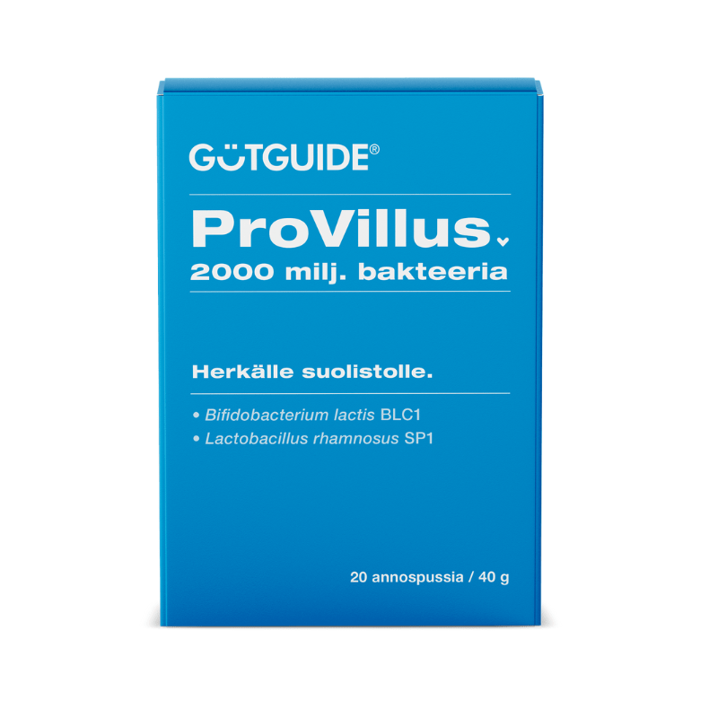 GutGuide® ProVillus pienskābes baktēriju produkts ir piemērots jutīgām un kairinātām zarnām un visām vecuma grupām, bez vecuma ierobežojuma. Produkts ir divu izvēlētu baktēriju celmu kombinācija. Lactobacillus rhamnosus SP1 + Bifidobacterium lactis BLC. Pamatojoties uz GutGuide ES patentu FI 127483 B.