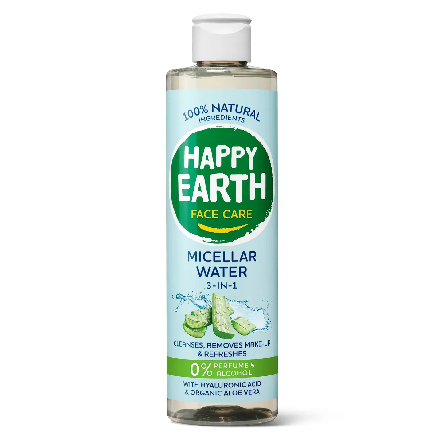 Happy Earth micelārais ūdens 3 vienā 300 ml efektīvi attīra ādu vienā solī, noņemot kosmētiku, netīrumus un piemaisījumus bez noskalošanas. Micelārais ūdens ar 100% dabīgu formulu satur hialuronskābi un bioloģisko alveju, kas mitrina un nomierina ādu, atstājot to svaigu, maigu un līdzsvarotu.