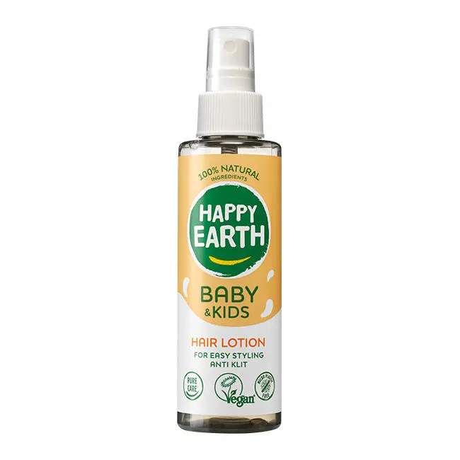 Happy Earth Baby & Kids matu atšķetināšanas losjons 150 ml maigi kopj mazuļa un bērna matus, padarot tos viegli ķemmējamus, mīkstus un bez pinkām. Losjons ar 100% dabīgu sastāvu samazina pūkošanos un palīdz savaldīt pat cirtainus matus, nepadarot tos taukainus. Maigā un hipoalerģiskā formula ir piemērota lietošanai no dzimšanas un droši kopj jutīgu galvas ādu.