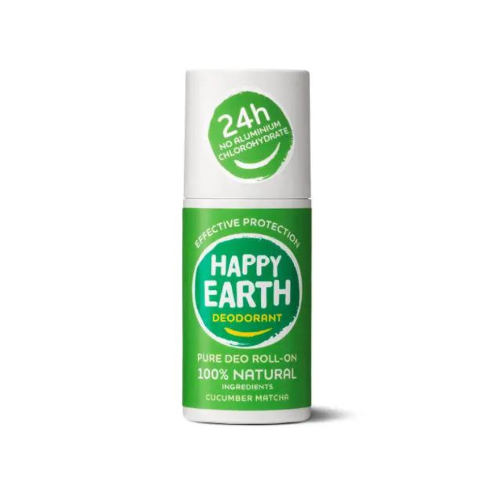 HAPPY EARTH DEODORANT ir 100% dabisks, 100% efektīvs un nesatur nevienu ķīmisku vielu. Atsvaidzinoša gurķa un mačas smarža, augu ekstrakti, ādu nomierinošs bioloģisks aloe vera un ēteriskās eļļas. HAPPY EARTH DEODORANT satur tikai ingredientus, kas padara tavu ādu laimīgu. Kad uzklāj ko uz ādas, ir patīkami zināt, ka nav piesārņojošu vai nepatīkamu sastāvdaļu kā ķimikālijas, alkohols vai citas kaitīgas piedevas. Tāpēc mēs ar lepnumu nesam NATRUE un Vegan Society sertifikātus. Un mūsu dezodoranta pudeles ir izgatavotas no 100% pārstrādātas plastmasas. Tādā veidā tu rūpējies ne tikai par sevi, bet arī par mūsu planētu! Lai tu būtu apmierināts: