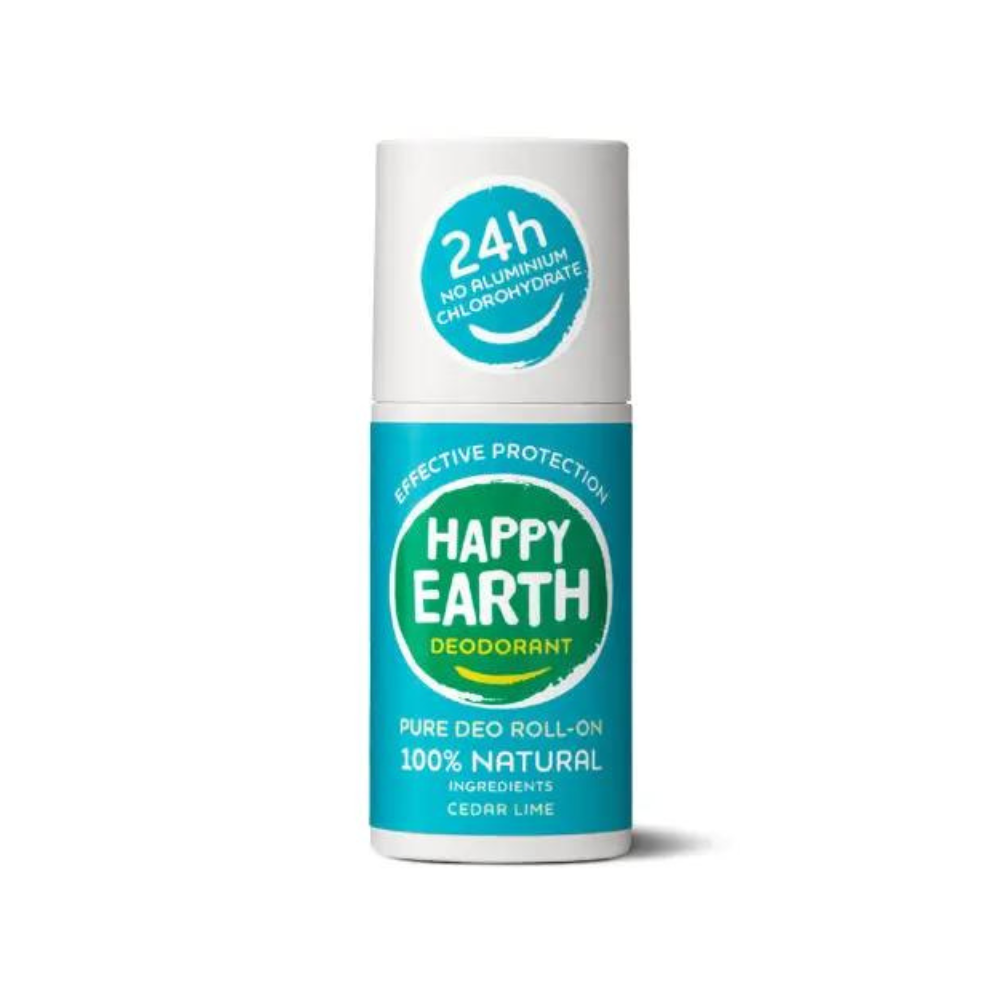 HAPPY EARTH DEODORANT ir 100% dabīgs, 100% efektīvs un nesatur nekādas ķimikālijas. Atsvaidzinošs laims un ciedrs, botāniskie ekstrakti, ādu nomierinošs bioloģiskais alvejas gels un ēteriskās eļļas. HAPPY EARTH DEODORANT sastāvā izmantojam tikai tādas sastāvdaļas, kas iepriecina Jūsu ādu. Pārklājot ādu ar šo līdzekli, Jūs varat būt droši, ka tas nesatur piesārņojošas vai nepatīkamas sastāvdaļas, piemēram, ķimikālijas, alkoholu vai citus kaitīgus piemaisījumus. Tāpēc mēs ar lepnumu nesam NATRUE un Vegan Society sertifikātu zīmes, bet mūsu dezodorantu pudeles ir ražotas no 100% pārstrādātas plastmasas. Tā Jūs rūpējaties ne tikai par sevi, bet arī par mūsu planētu!