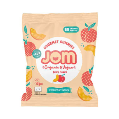 Saki sveicienu JOM skābajām persiku želejkonfektēm un sagatavojies saldināt katru kumosu! Šīs gardās konfektes, ar mīlestību gatavotas Zviedrijā, tiek ražotas nelielās partijās, izmantojot tikai bioloģiskas un vegānu sertificētas sastāvdaļas. Tās ir pilnībā brīvas no lipekļa, palmu eļļas un citiem alergēniem. Šie vienas porcijas uzkodu iepakojumi ir lieliski piemēroti ēšanai ceļā — praktiski, videi draudzīgi un ar pārstrādājamu iepakojumu.