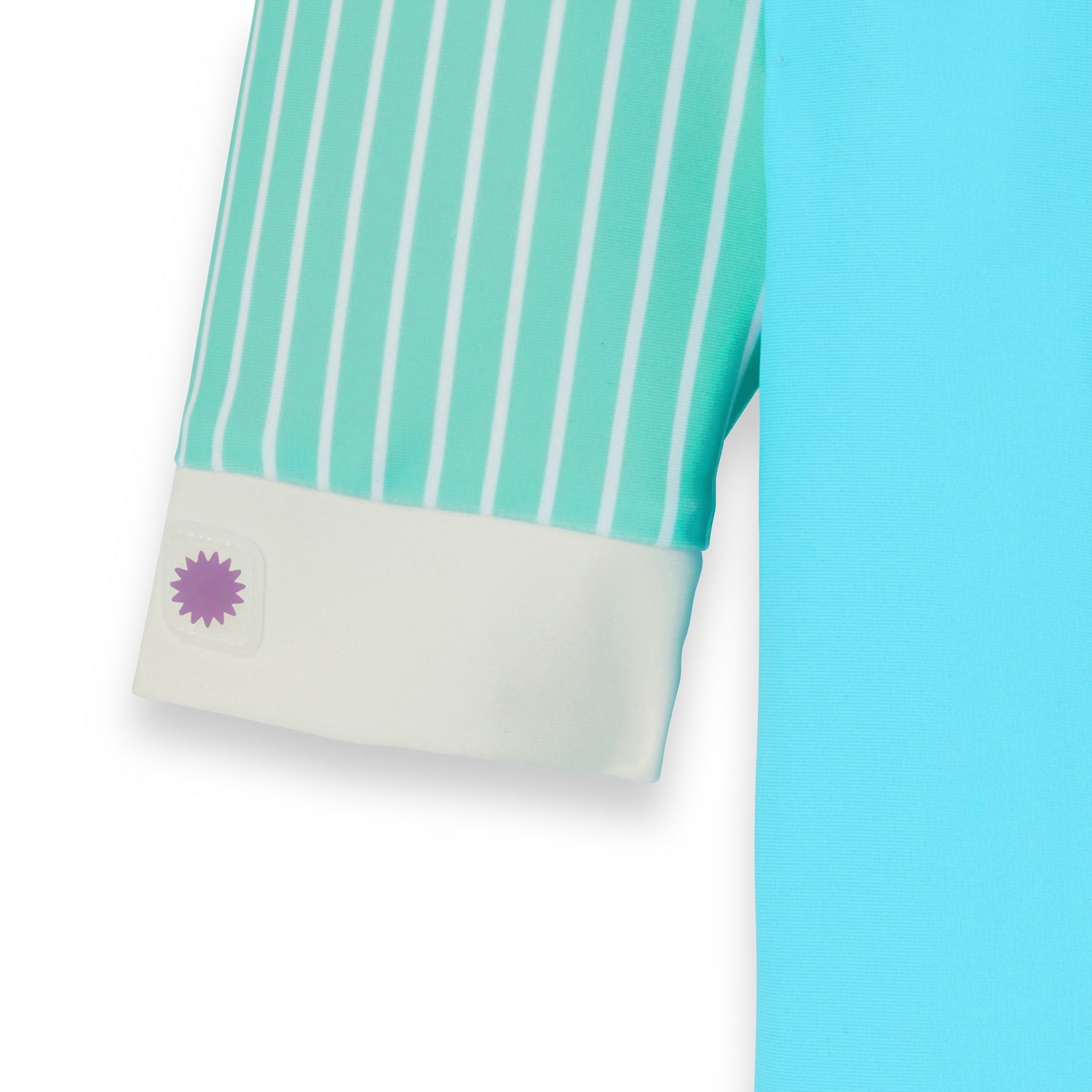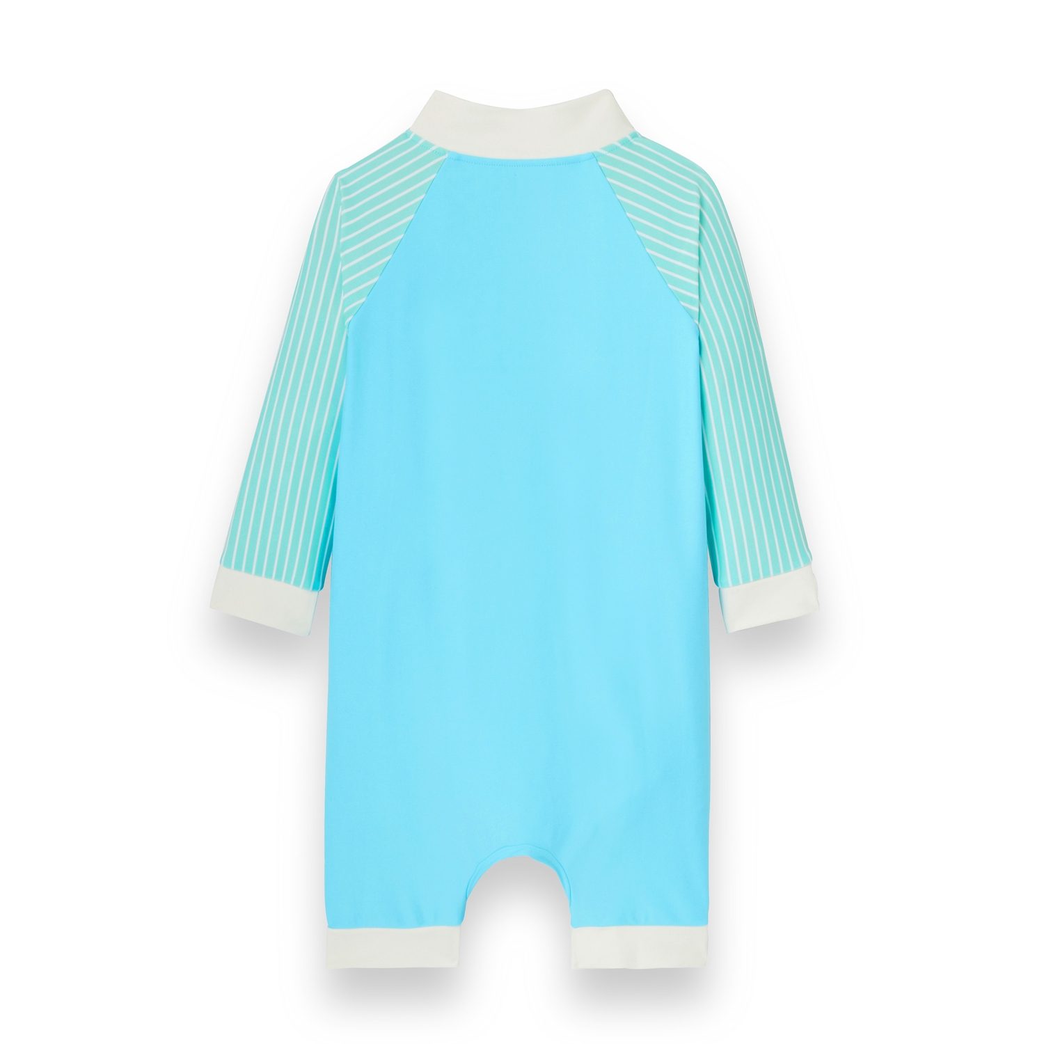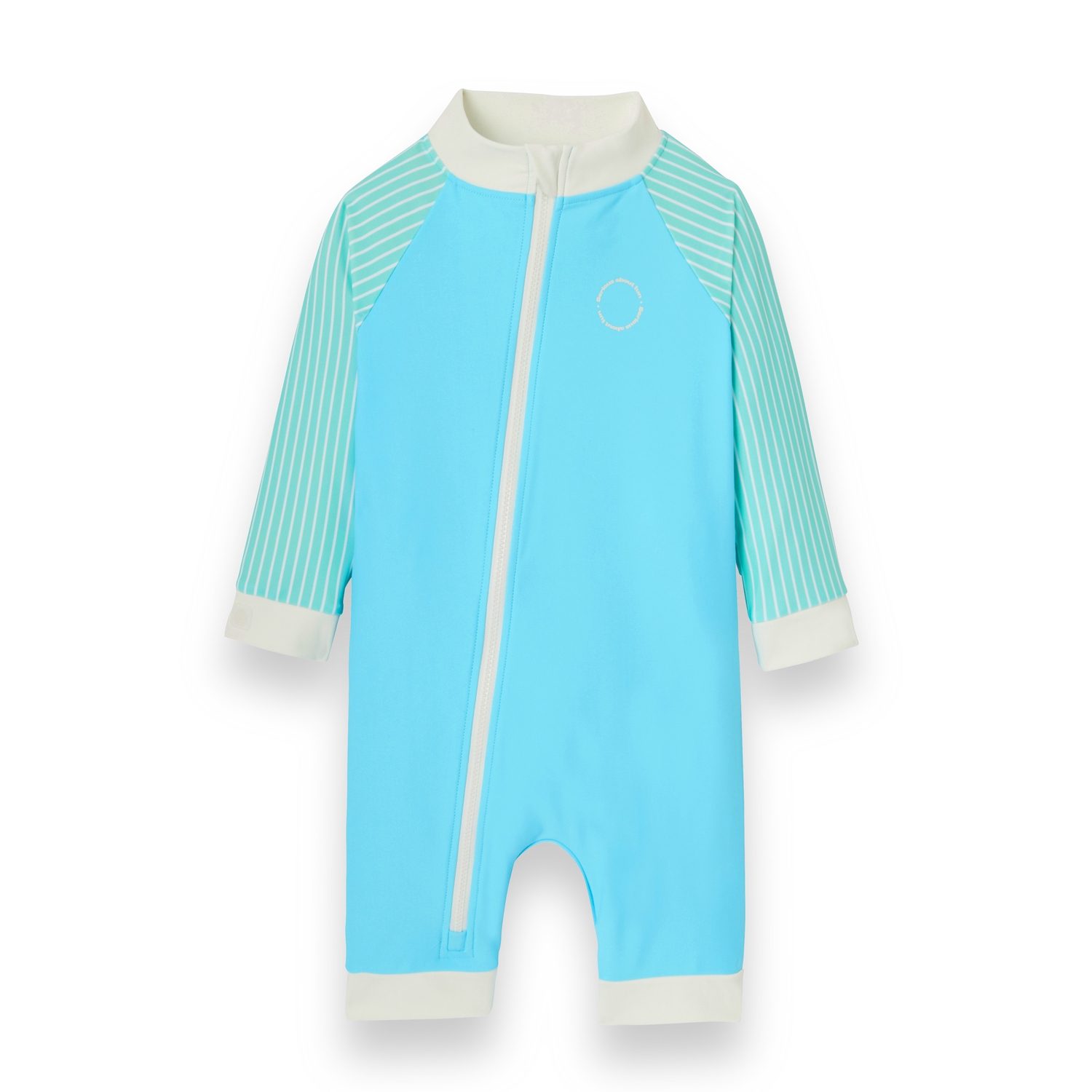 UPF 50+ audums piedāvā pilnīgu aizsardzību pret kaitīgajiem UV stariem, palīdzot saglabāt bērnu jutīgu ādu drošībā. Vidēja garuma piedurknes un bikšu staras nodrošina lielāku pārklājumu, un pilna garuma rāvējslēdzējs no kakla līdz kājai atvieglo ģērbšanos un autiņu maiņu pat visnemierīgākajiem zīdaiņiem.