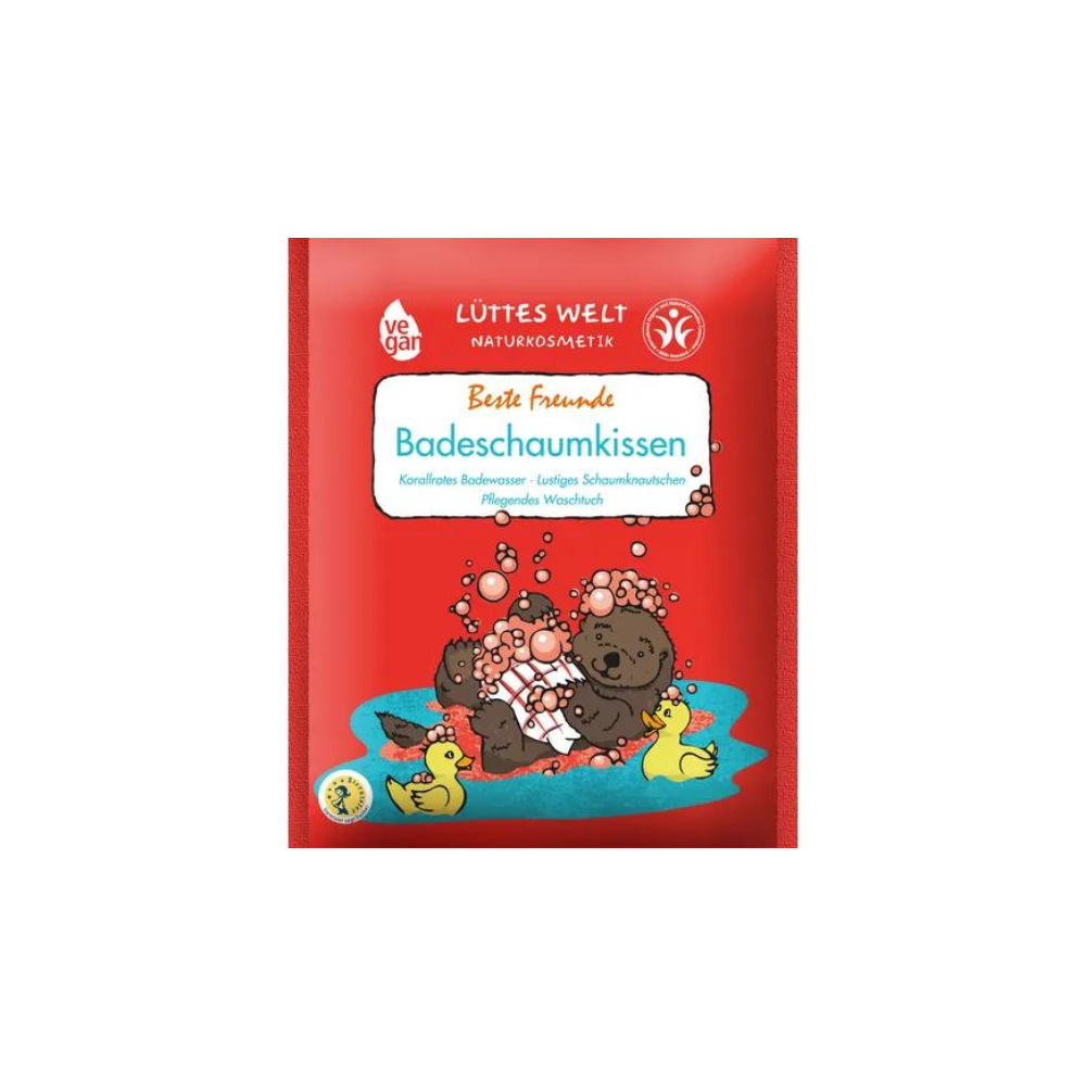 Lüttes Welt Best Friends vannas putu spilventiņš ir ļoti mīksts un iekrāso ūdeni brīnišķīgi sarkanā krāsā.