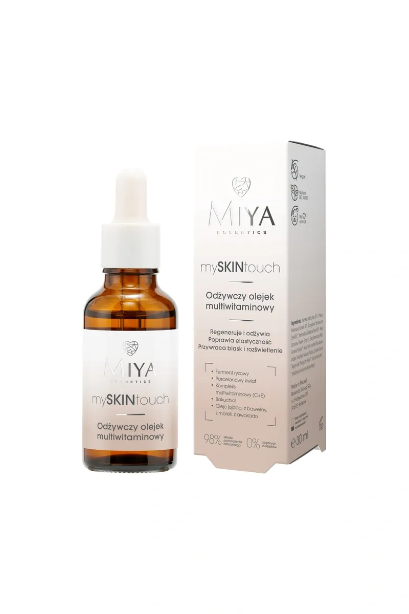 mySKINtouch ir apzināts un maigs brīdis parūpēties par sevi – rituāls, kas nomierina, atjauno un piedāvā patīkamu pauzi. Multivitamīnu sejas eļļa apvieno dabiskas eļļas un vitamīnus, kas stiprina, baro un piešķir ādai skaistu mirdzumu. Tā samazina stresa pazīmes uz ādas, piemēram, apsārtumu, kairinājumu un sasprindzinājuma sajūtu. Ātri uzsūcas, neatstājot taukainu slāni un neaizsprosto poras. Multifunkcionāls – piemērots lietošanai uz sejas, kakla, dekoltē, rokām un nagiem.