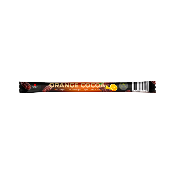 Vegānu, bezglutēna augļu batoniņš bez pievienota cukura, gatavots no dabīgām sastāvdaļām. Dateles dabiskā saldums kombinācijā ar kakao pulvera bagātību un svaigo citrusaugļu noti no apelsīnu eļļas rada lieliski šokolādīgu un dzīvīgu garšu piedzīvojumu. Veselīga un enerģiju sniedzoša uzkoda, ideāli piemērota ātrai našķēšanai jebkurā laikā.