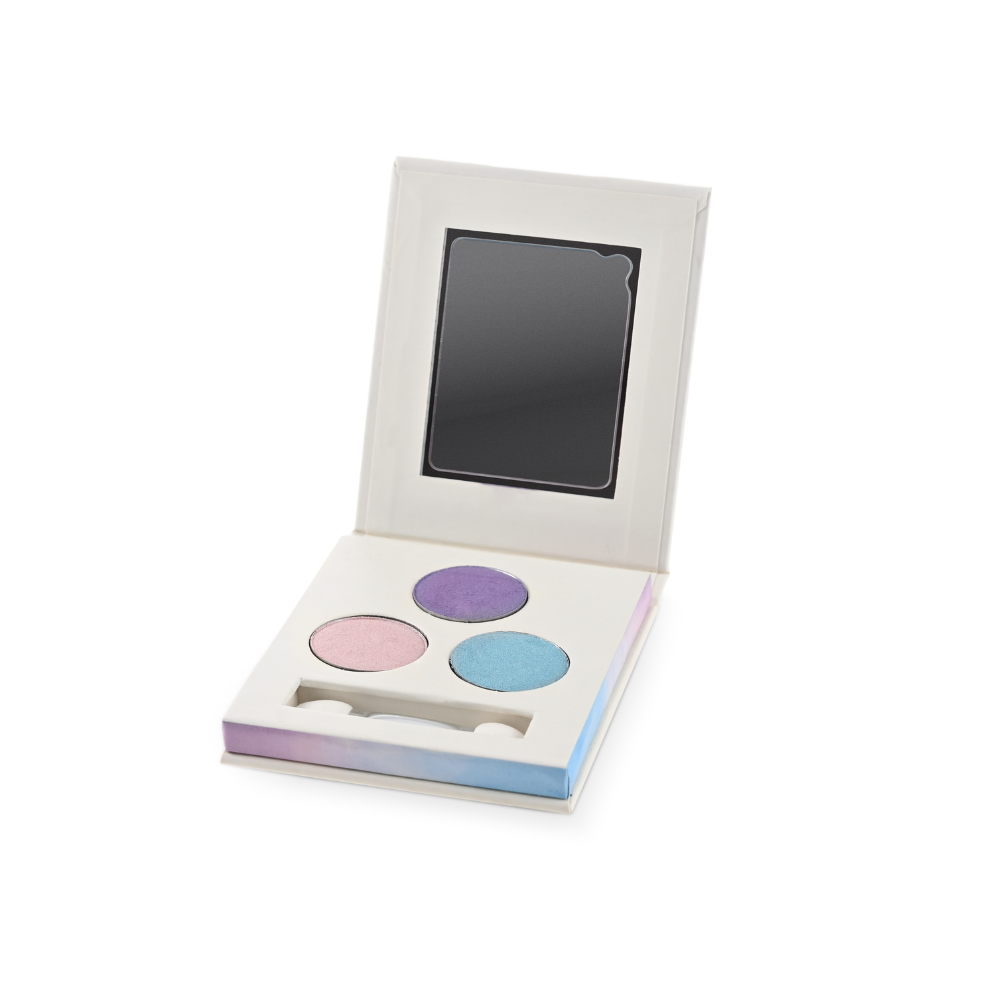 Palete ar divpusēju aplikatoru, spoguli un 3 mirdzošiem perlamutra acu ēnu toņiem.