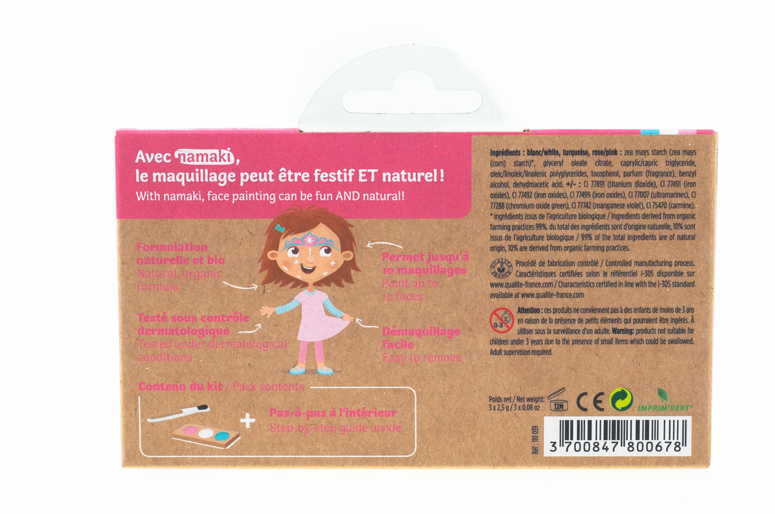 Krāsas nesatur parasti grima krāsās atrodamās ķīmiskās vielas. Visas krāsas ir hipoalerģiskas un uz ūdens bāzes, izgatavotas no dabīgiem augu izcelsmes vai minerālu pigmentiem.