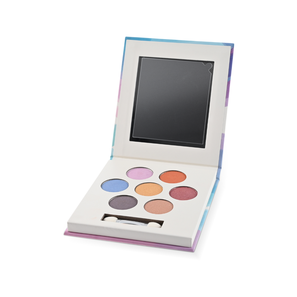 Paletē ir divpusējs aplikators, spogulis un 7 mirdzošas perlamutra acu ēnas.