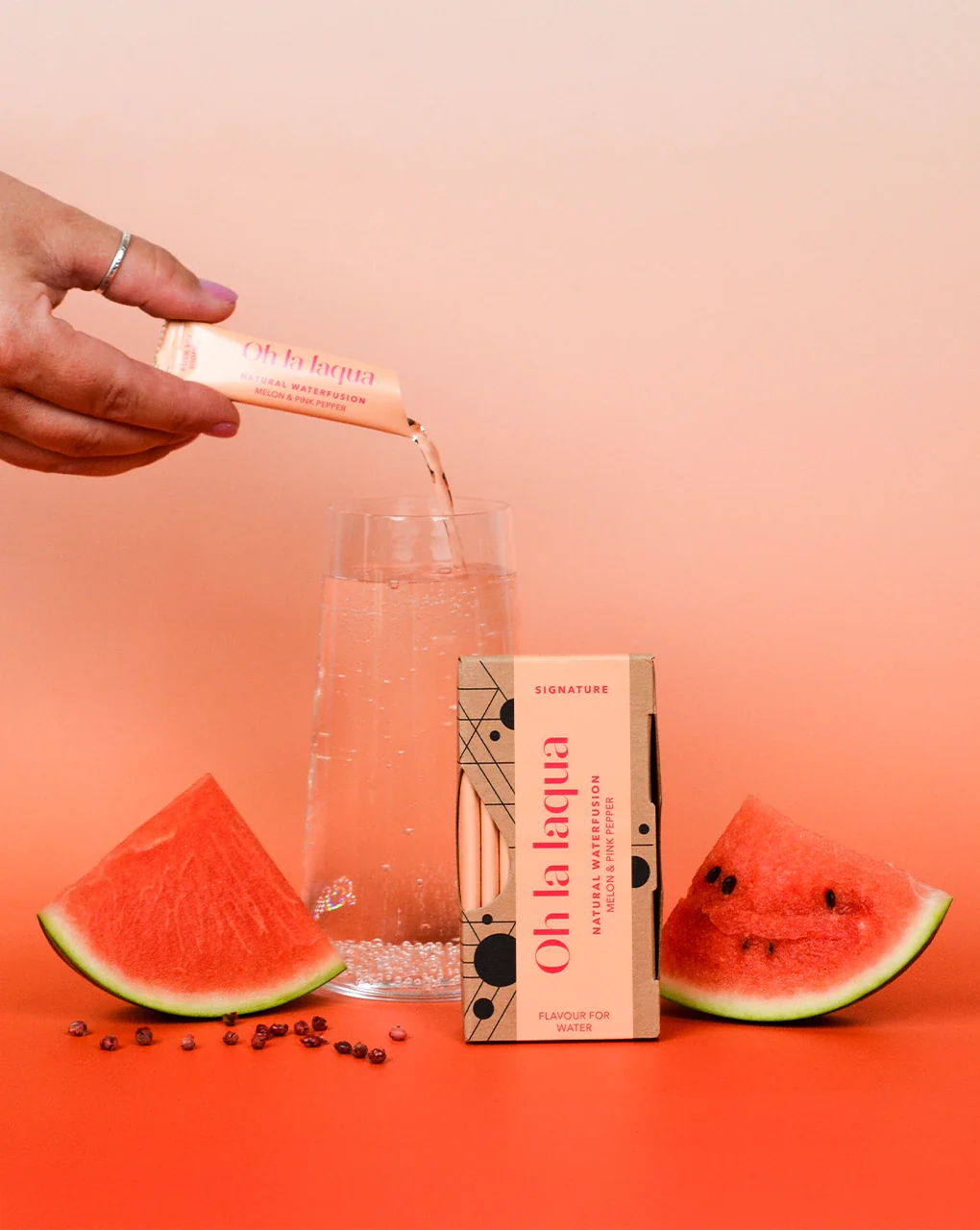 – Pārvērš ūdeni par melones un rozā piparu garšas dzērienu 3 sekundēs