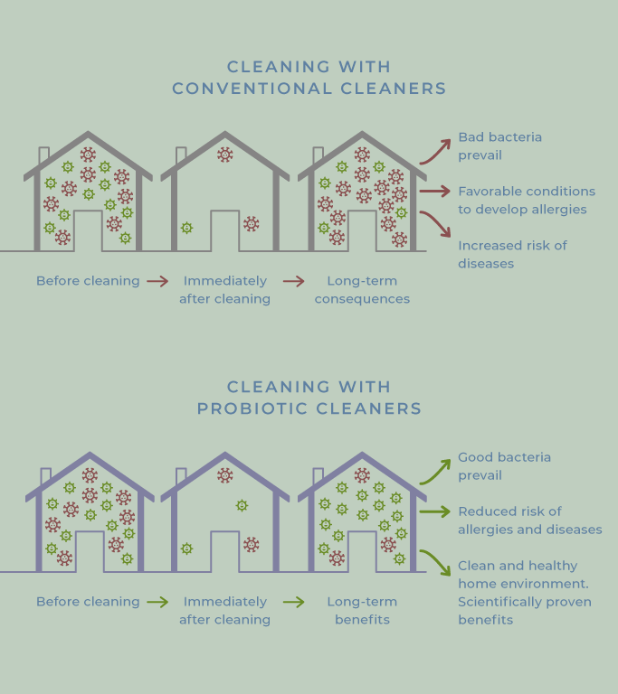 Tradicionālie tīrīšanas līdzekļi ne tikai piesārņo māju ar agresīvām ķīmiskām vielām, bet darbojas arī kā antibiotikas – tie izjauc jūsu mājas mikrofloras līdzsvaru, iznīcinot ne tikai sliktās, bet arī labās baktērijas. Rezultātā veidojas baktēriju nelīdzsvarotība, kurā dominē sliktās baktērijas. Šāda mājas vide var kaitēt jums un jūsu ģimenei.