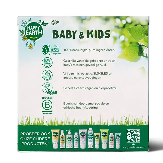 Happy Earth Zīdaiņu un Bērnu Starta Komplekts ir droša un dabiska izvēle ikdienas bērna ādas un matu kopšanai. Komplektā ietilpst: 100 ml zīdaiņu šampūns – īpaši maigs un rūpējas, piemērots lietošanai no dzimšanas. Maigi tīra matus, padarot tos mīkstus un viegli ķemmējamus. 100 ml mazgāšanas un vannošanas želeja – ziepju nesaturoša 2-in-1 mazgāšanas želeja, kas ļoti maigi attīra jutīgu ādu un satur augu izcelsmes ādas mīkstinātāju papildu mitrināšanai.