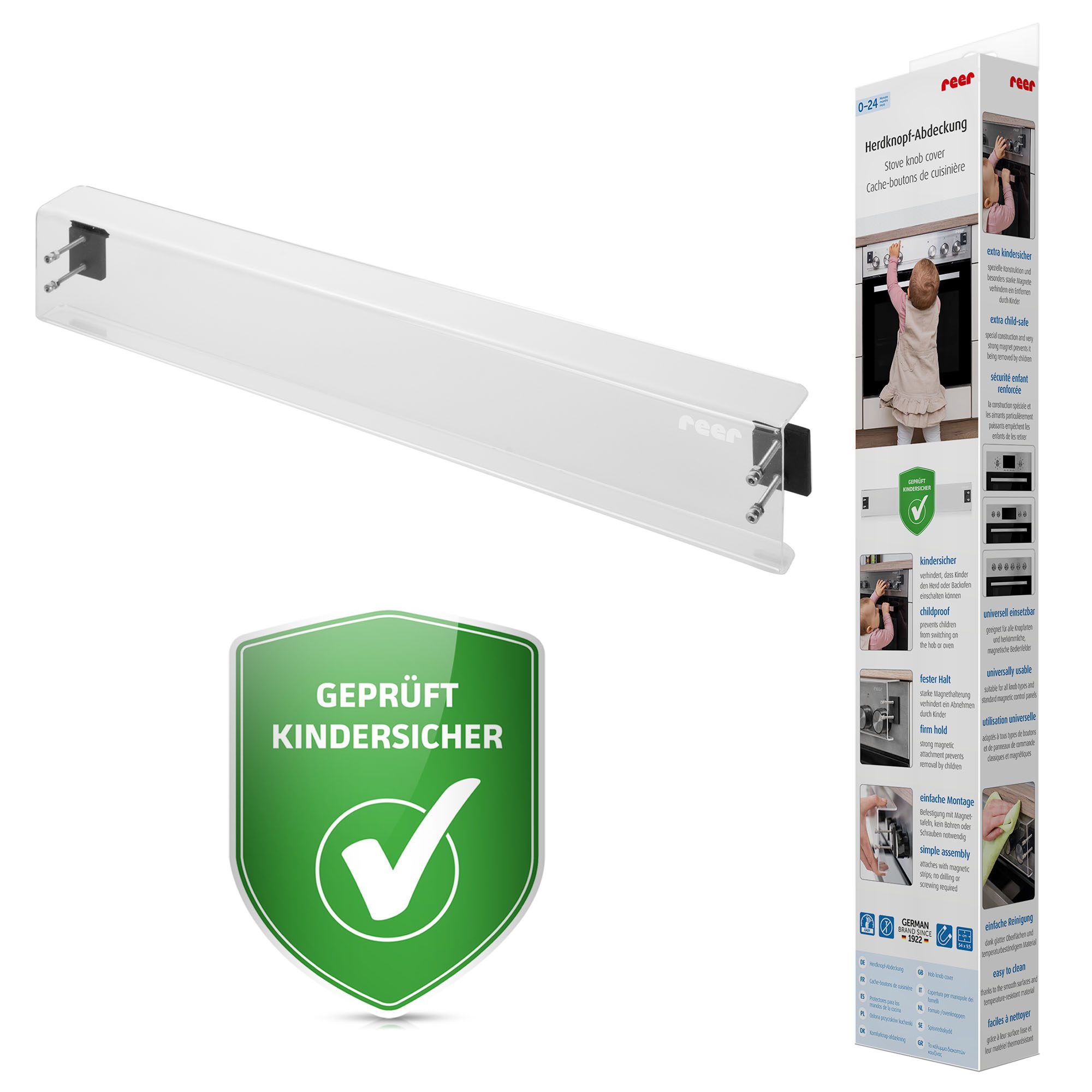 Pateicoties izmēram (54 cm x 9,5 cm x 2,9 cm), šis aizsargs der lielākajai daļai standarta plīšu un cepeškrāšņu ar magnētiskiem vadības paneļiem neatkarīgi no tā, vai pogas ir izvirzītas vai iegremdētas. Nepieciešama tikai 3 mm sprauga starp darba virsmu un vadības paneli. Caurspīdīgais akrila stikls nemanāmi iekļaujas jebkura stila virtuvē, nepievēršot uzmanību bīstamajai zonai.