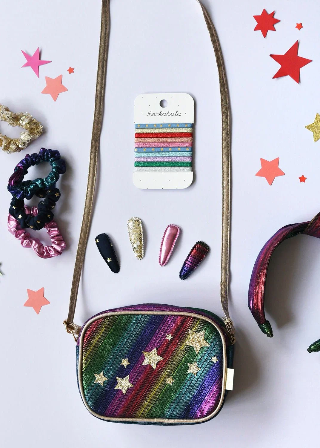 Iedejojiet diskotēkas ritmos ar Disco Fever somu! Soma ir izgatavota no mīksta auduma, rotāta ar folijas apdruku varavīksnes toņos un mirdzošām zelta zvaigznēm. Iekšējais oderējums ir zvaigžņots, somai ir rāvējslēdzēja aizdare un regulējama pleca siksna ar drošības nodalījuma punktu. Ideāla vieta, kur paslēpt visus savus diskotēkas piederumus!