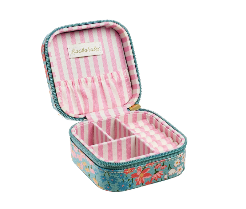 Burvīgā samta juvelierizstrādājumu kaste ir ideāla vieta, kur glabāt visas savas Rockahula rotas un iecienītākos dārgumus drošībā! Pārklāta ar Heidi ziedu audumu. Juvelierizstrādājumu kaste atveras, atklājot trīs sekcijas, kabatu un atsevišķu vietu auskariem un gredzeniem. Iekšpusē ar konfekšu rozā svītru audumu.