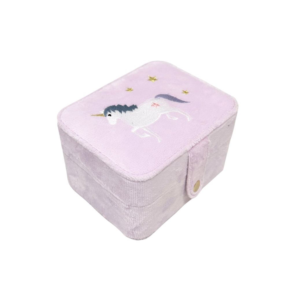 Burvīgā samta rotaslietu kastīte ir ideāla vieta, kur droši glabāt visas savas Rockahula rotas un iecienītākos dārgumus! Kastīte ir izšūta ar vienradzi un mirdzošām zvaigznēm. Atverot kastīti, atklājas trīs nodalījumi, kabatiņa un atsevišķa vieta auskariem un gredzeniem. Iekšpuse izklāta ar zvaigznainu audumu.