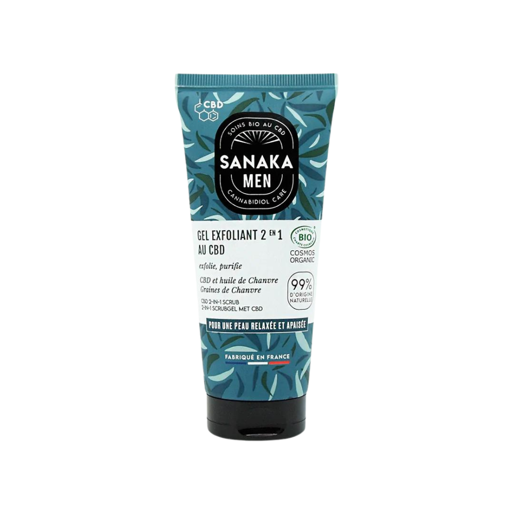 SANAKA MEN 2-in-1 eksfoliējošs gels ar COSMOS ORGANIC sertifikātu, izgatavots no 99% dabīgas izcelsmes sastāvdaļām, satur CBD* un organisko kaņepju eļļas kompleksu, lai noņemtu netīrumus un saudzīgi attīrītu un eksfoliētu ādu.