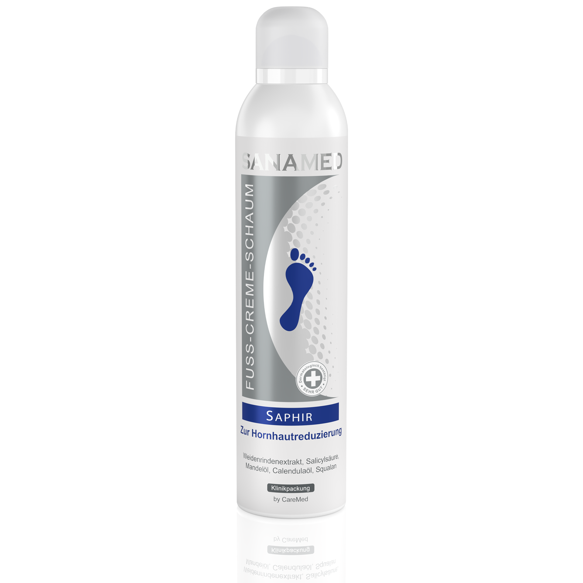 SANAMED Saphir pēdu putu krēms ir ātri uzsūcošs putu krēms. Satur 10% urīnvielas, glicerīnu, vītolu mizas ekstraktu un salicilskābi. Šīs vieglās konsistences krēmveida putas intensīvi kopj un mitrina ādu, kā arī palēnina jaunas sabiezējušas ādas izveidi. Nesatur PEG, smaržvielas vai krāsvielas.