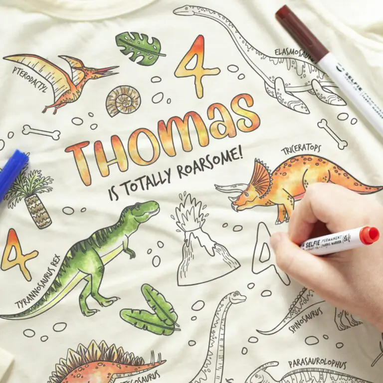 Krekls izgatavots no viegla un ērta džersija auduma ar unikālu dinozauru dizainu, kas gatavs bērna fantāzijai. Komplektā iekļautie auduma flomasteri satur kvalitatīvu UV tinti, kas nostiprinās dabīgi 24 stundu laikā vai arī, gludinot (pieaugušā uzraudzībā). Pēc nostiprināšanas krāsas neizbalē, un kreklu var valkāt un mazgāt atkārtoti.