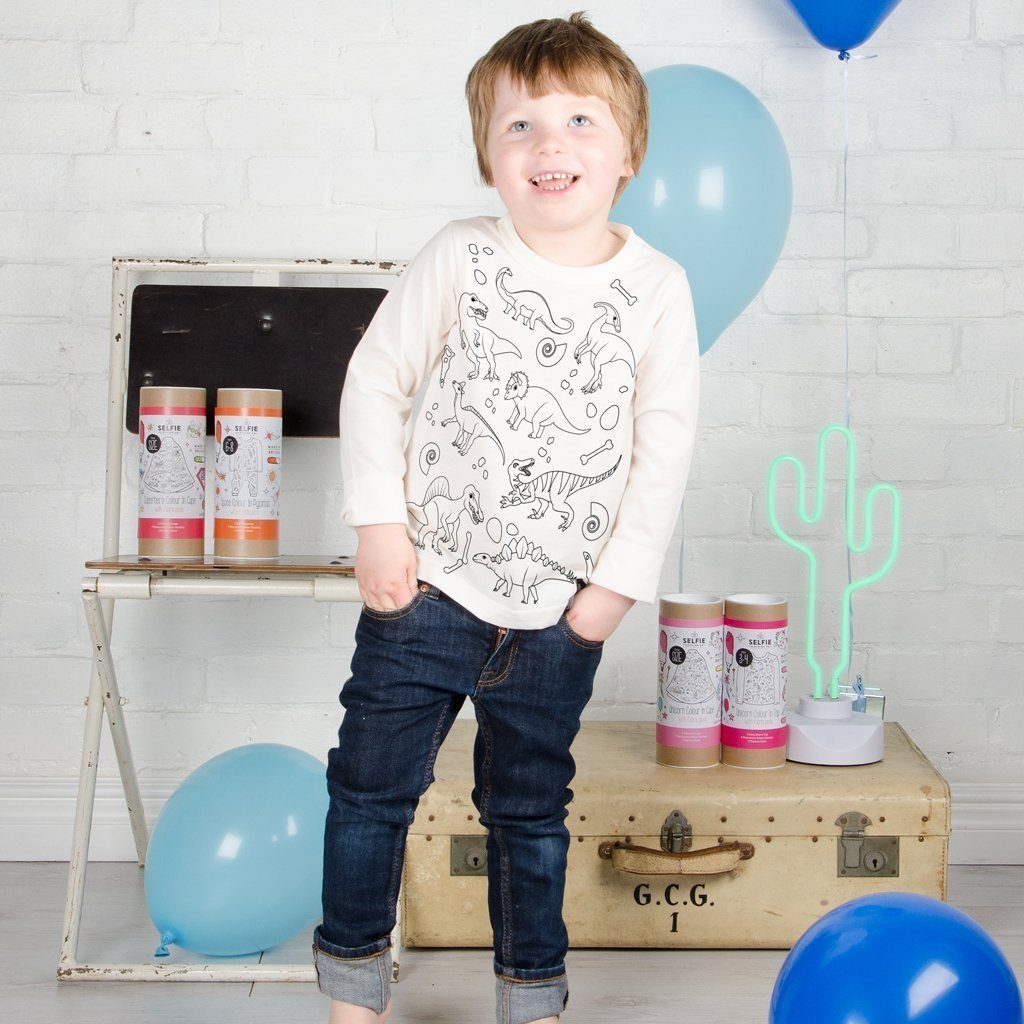 Atdzīvini aizvēsturiskos milžus ar Dinosaur Colour-In kreklu, kur bērni paši var iekrāsot spēcīgos T-Rex, Stegosaurus un vēl daudz ko citu! Ideāls radošās nodarbes un ērtas ikdienas apģērba apvienojums.
