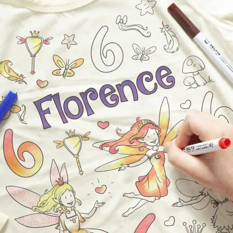 T-krekls ir izgatavots no viegla un ērta trikotāžas auduma maisījuma, kas ir ideāli piemērots vakaram. Uzdrukātajam, krāsojamam dizainam jāatbilst bērna radošumam. Komplektā iekļautajos auduma pildspalvās ir augstas kvalitātes UV tinte, kas nostiprinās ar gaisa žāvēšanu 24 stundās vai, kad to nogludina ar gludekli (to dara pieaugušais). Kad krāsas ir nostiprinātas, tās neizbalē, un pidžamu var atkārtoti valkāt un mazgāt.