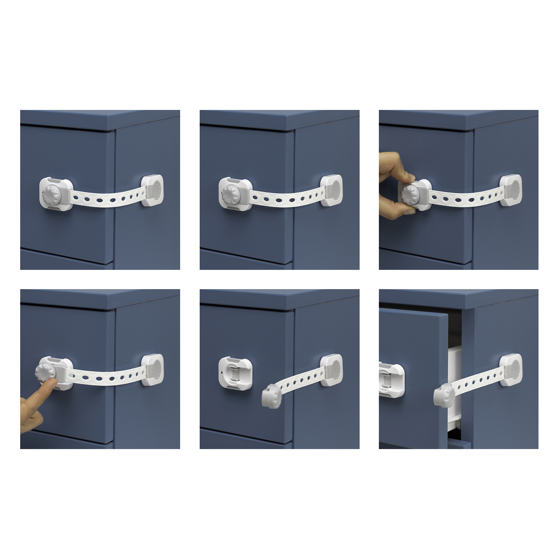 SIPO komplekts no 6 regulējamiem skapju slēdzenēm ar vienkāršu fiksācijas funkciju, kas pieaugušajiem nodrošina ātru piekļuvi, bet pasargā no atvēršanas maziem bērniem. Slēdzenēm ir regulējams garums. Tā ir praktiska un vienkārša drošības risinājuma iespēja, kas palīdz novērst bērna piekļuvi bīstamiem priekšmetiem vai vielām skapjos un atvilktnēs.