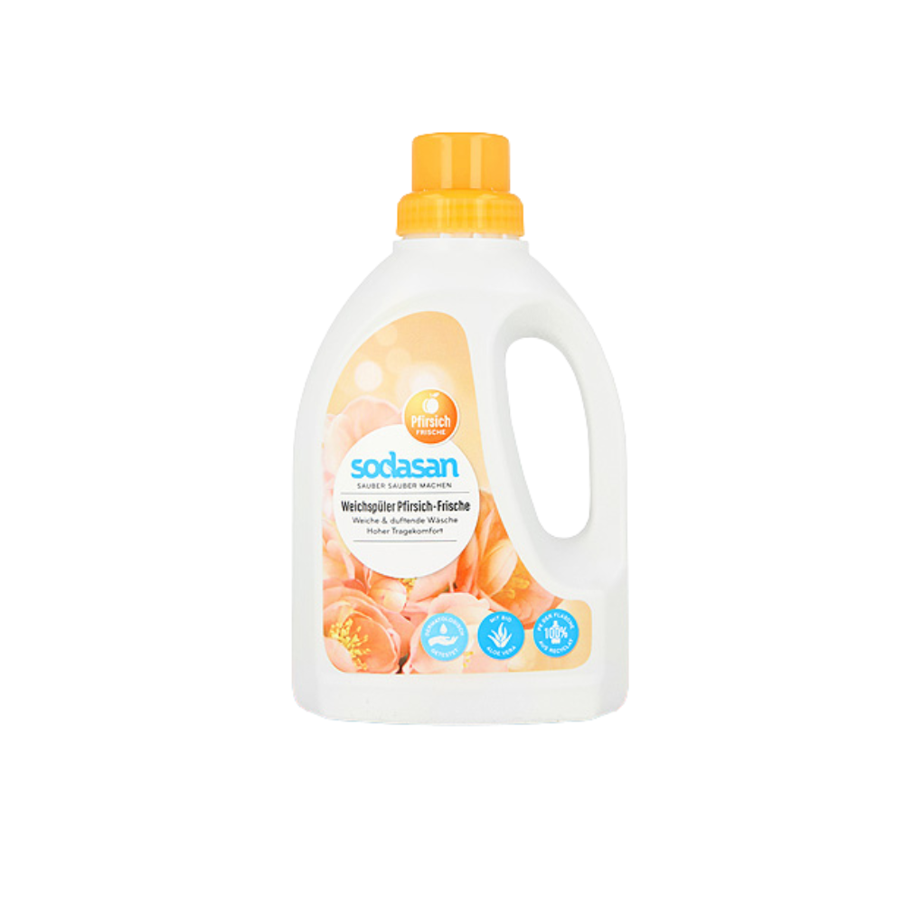 Sodasan veļas mīkstinātājs ar persiku aromātu piešķir veļai maigu svaigumu un persiku smaržu. Inovatīvā formula ar augu izcelsmes sastāvdaļām un bioloģisko alveju nodrošina audumiem patīkamu, maigu valkāšanas komfortu. Mazgāšanas līdzekļa atlikumi tiek saudzīgi noņemti. Piemērots visu veidu šķiedrām.