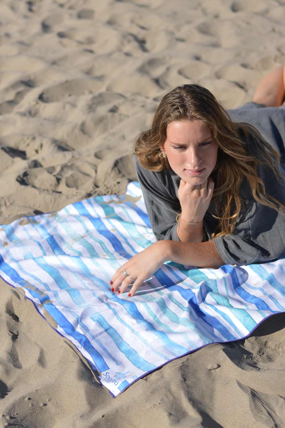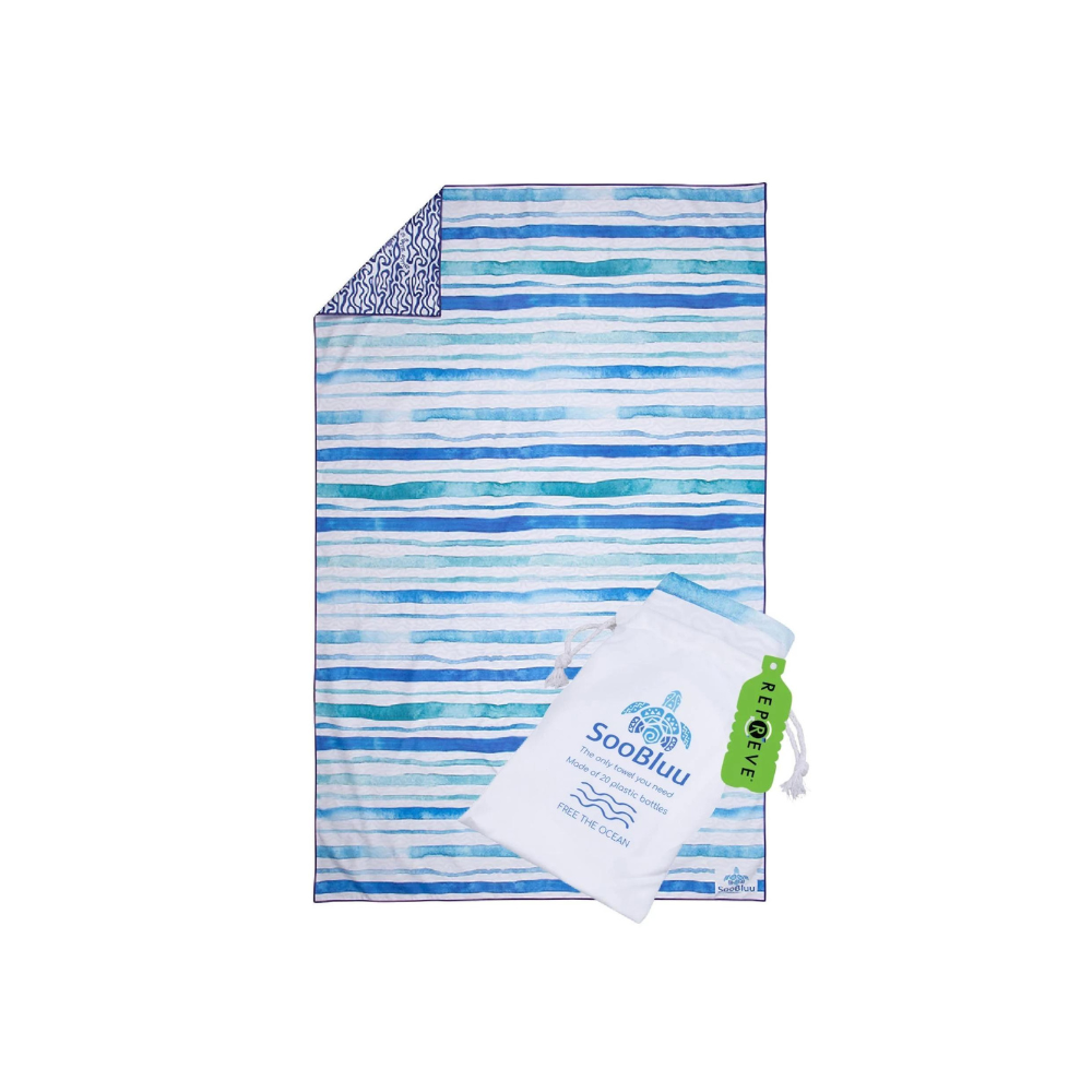 Ātri žūstošs, glīts pludmales dvielis ar divpusēju apdruku. Katram Shoresyde dvielim izgatavošanai tiek izmantotas līdz pat 20 no okeāna vai sauszemes savāktas plastmasas pudeles.