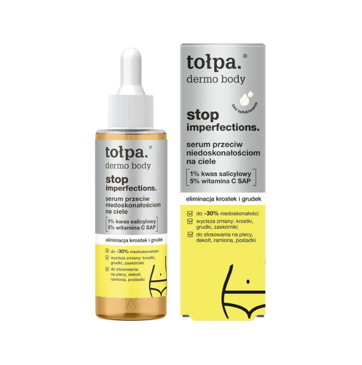 Tołpa Dermo Body pret nepilnībām vērsts ķermeņa serums ir īpaši izstrādāts mugurai, dekoltē, rokām un sēžai, kur āda var izrādīt akni, papulas, komedonus un citas nepilnības. Šis dermokosmētikas līdzeklis attīra poras, regulē sebuma izdalīšanos un mazina ādas nelīdzenumus, atstājot ādu gludu, svaigu un maigu.