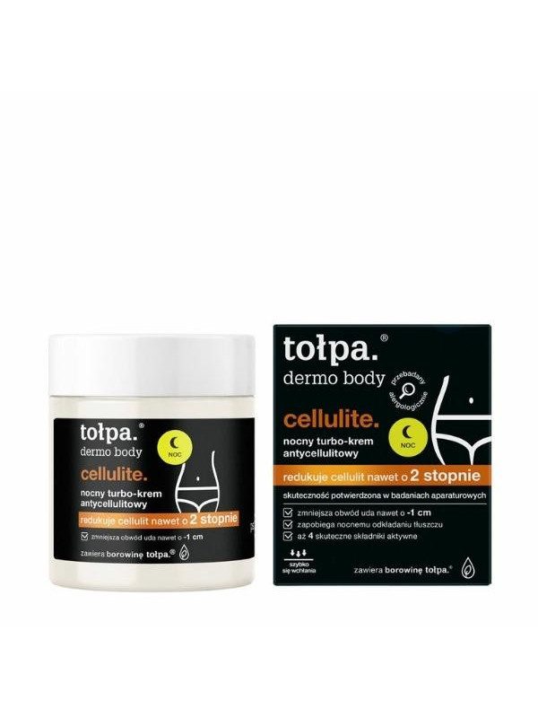 Tołpa Dermo Body Cellulite Night Turbo krēms stimulē tauku dedzināšanu, samazina taukaudu biezumu un palīdz samazināt celulīta redzamību miega laikā. Tas palīdz ķermeņa konturēšanai, uzlabo toksīnu izvadīšanu, kā arī mitrina un izlīdzina ādu. Lietot katru vakaru uz problemātiskajām zonām.