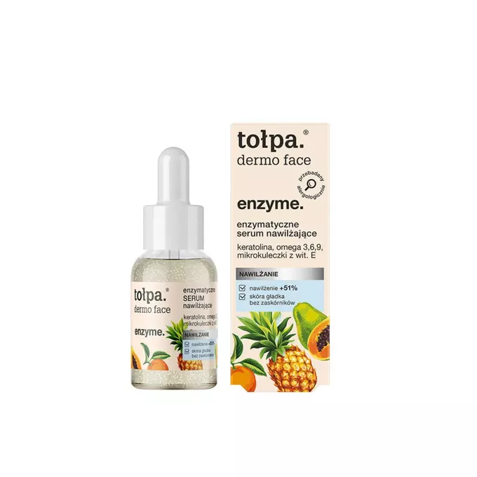 Tołpa Dermo Face Enzīmatiskais mitrinošais serums atbalsta ādas eksfoliācijas un reģenerācijas procesus, palīdzot noņemt atmirušās ādas šūnas un atjaunot ādas starojumu. Bagātīgā formula mitrina, baro un atdzīvina nogurušu, blāvu un sausu ādu.