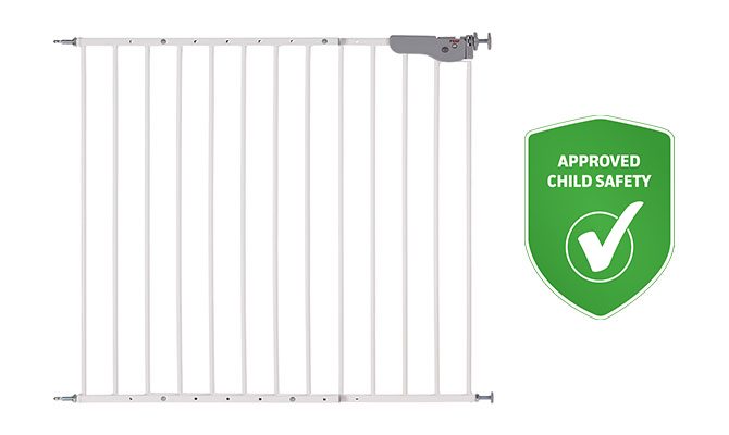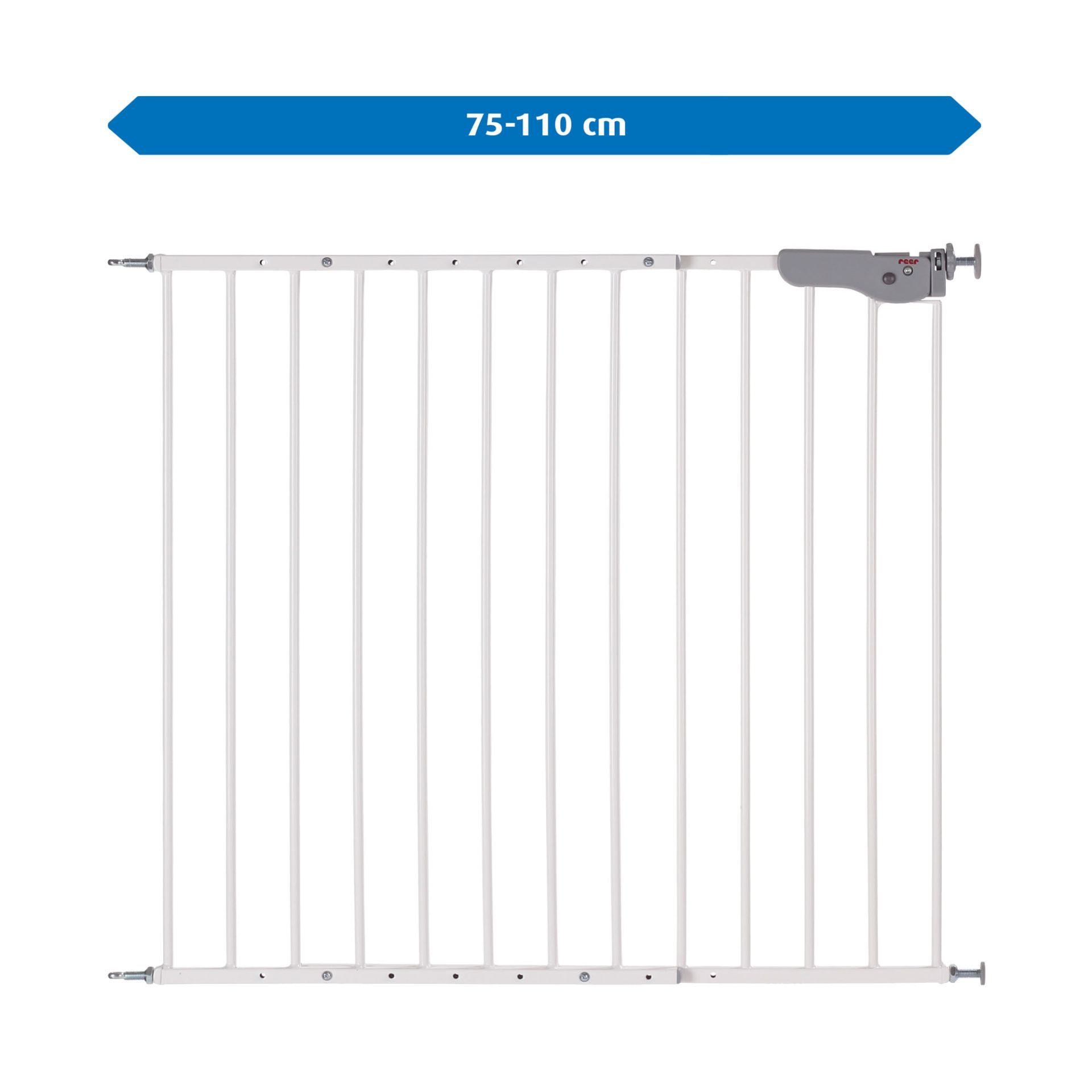 Drošības vārtu platums ir nepārtraukti regulējams no 75 līdz 110 cm, ļaujot tos pielāgot dažādu platumu atvērumiem bez papildu pagarinājumiem. Vārti ir ideāli piemēroti, lai aizvērtu gan kāpņu augšdaļu vai apakšu, gan arī platākas durvis vai ejas. Pateicoties regulējamiem 4 punktu stiprinājumiem, vārtus var droši un stabilā veidā uzstādīt arī uz nelīdzena sienas vai apmales – katru stiprinājuma punktu var individuāli pielāgot.